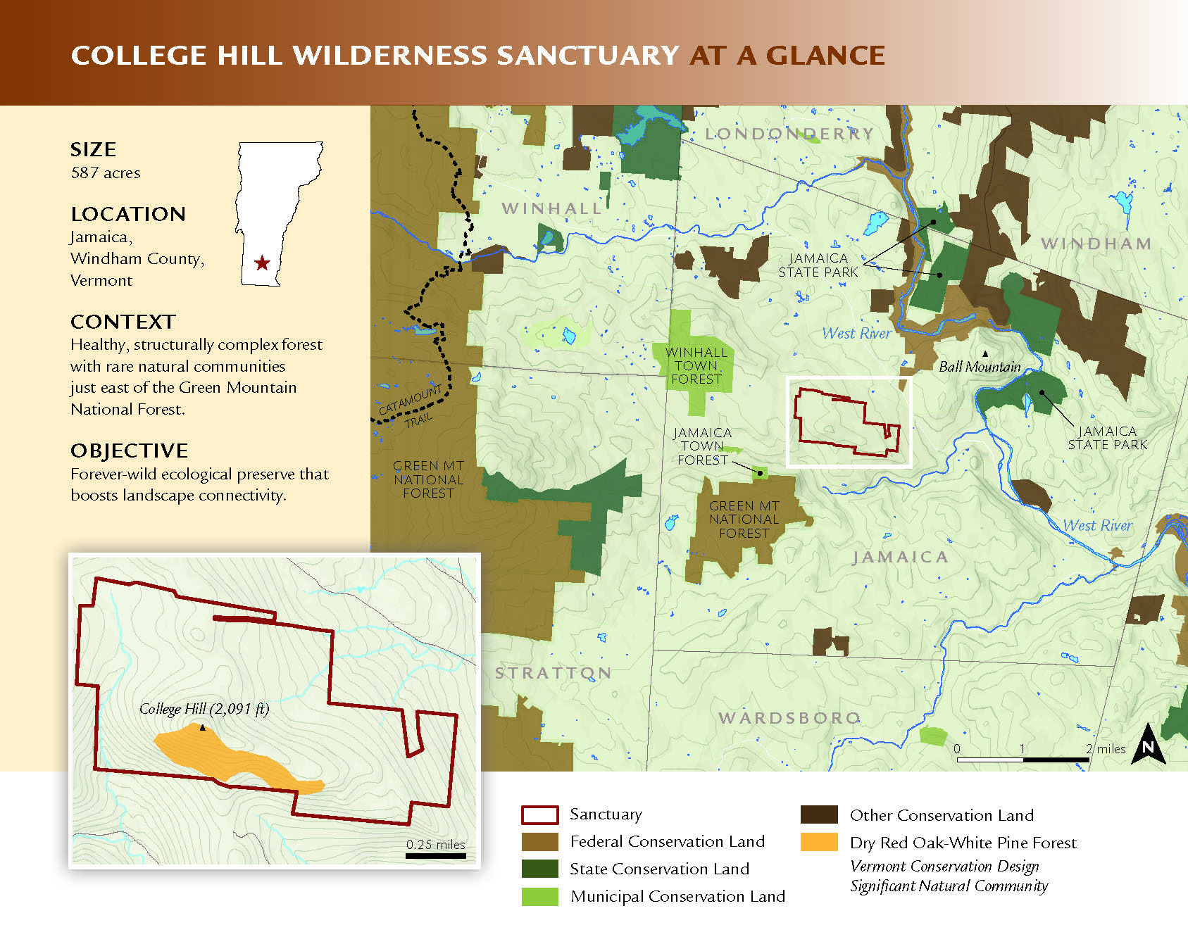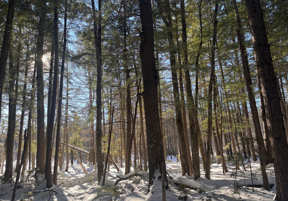 Northeast Wilderness Trust’s 587-acre College Hill Wilderness Sanctuary, established in 2025 in Jamaica, Vermont, is a refuge for wildlife and well on its way to becoming an old-growth forest. Four parcels for sale on the northern border of the Sanctuary—170 acres in total—now offer an opportunity to expand the Sanctuary by nearly thirty percent.